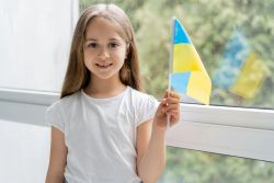 Glückliches kleines Mädchen hält Ukraine-Flagge hoch.
