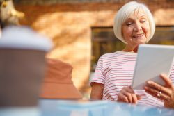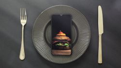 Eine junge Frau telefoniert mit ihrem Smartphone, während sie einen Tablet-PC hält