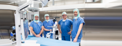 Die Primarii Martin Dominkus (Speising), Wolfgang Schneider (Herz-Jesu-KH), Gerald Loho (Herz-Jesu-KH) und Christian Albrecht (Speising) mit dem Velys-Orthopädieroboter. (Credits: Vinzenz Gruppe Wien / Kawka)