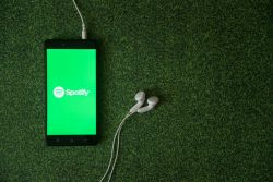 Spotify-Logo auf Smartphone-Bildschirm auf grünem Gras-Hintergrund.