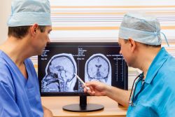 Zwei Ärzte bei der Untersuchung eines MRT-Scans des Gehirns auf Monitor