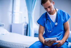 Junger Arzt am Tablet