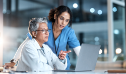 Ärztin und Krankenschwester diskutieren Patientenfall.