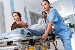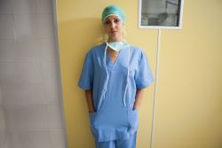 Krankenschwester lehnt an Türe im Krankenhaus.