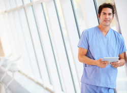 Pfleger mit Tablet-PC in moderner Rehaeinrichtung.