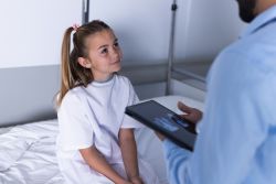 Junges Mädchen sitzt im stationären Bett. Arzt führt Patientengespräch nach OP. führt ein Gespräch