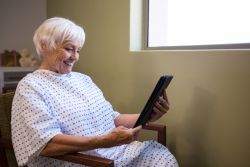 Sitzende Patientin nutzt Tablet Device