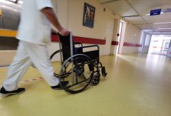 Krankenhausflur: Arzt schiebt leeren Rollstuhl