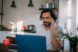 Eine junge Frau telefoniert mit ihrem Smartphone, während sie einen Tablet-PC hält