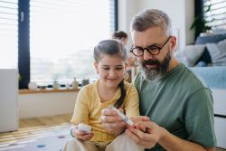 Junges Mädchen und ihr Papa beim Blutzuckerwert-Messen zu Hause.