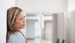 Long-COVID-Patientin rastet sich an der Wand im Krankenhausgang aus.