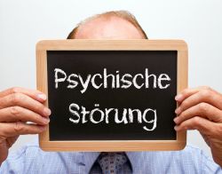 Älterer Mann deckt sein Gesicht mit Schild "Psychische Störung" ab.