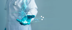 Mediziner hält blaue Helix DNA-Struktur auf Hologramm .
