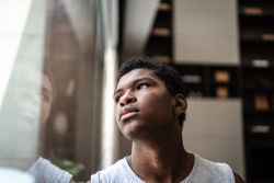 Nachdenklicher Jugendlicher schaut aus dem Fenster eines Jugendheims.