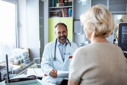 Praktischer Arzt und Patientin im Gespräch in Ordination