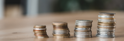 Stapel von Münzen auf hölzerner Tischplatte.