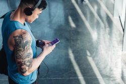 Junge Sportler nutzen Smartphone mit Gesundheitsdaten-App und hören Musik.