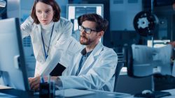 Labormitarbeiter prüfen gemeinsam Befunde am Desktop