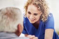 Junge Pflegerin im Gespräch mit Klienten.