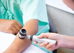 Arzt mit Tablet spricht mit jugendlichem Patienten.