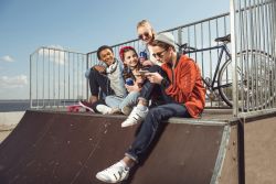 Jugendliche mit Energydrink & Mobiltelefon sitzen auf Halfpipe.