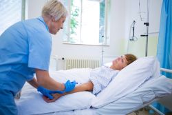 Pflegerin im Krankenhaus verabreicht einer Patientin eine Injektion.