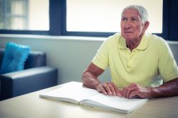 Blinder Pensionist "liest" Buch.