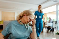 Frustrierte, müde Pflegerin.