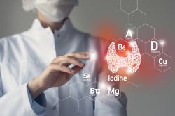 Verschwommenes Porträt eines Arztes mit hervorgehobener roter Schilddrüse.