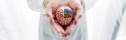 Panoramaaufnahme von Arzt mit Modell des Gehirns in Klinik.