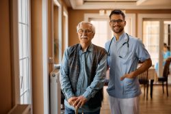 Alter Mann und sein betreuender Pfleger im Altenpflegeheim.