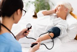 Blutdruckmessung bei multimorbid-kranker Seniorin.