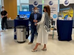 Fachgespräch zweier langjährig Bekannter: HTBLA Traun Direktorin Mag. Doris Riha und HTBLA Traun Absolvent Peter Fleschurz.