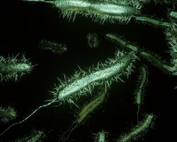 3D-Illustartion einer Bakteriengruppe im Abwasser.