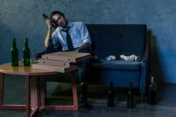 Depressiver alkoholabhängiger Mann trinkt auf Couch