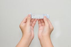 Ärztin hält Identifikationsband für Patienten in Händen.