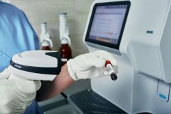 Scannen des Barcodes des Reagenzglases mit Blut - Hämatologie-Analysator im Hintergrund.