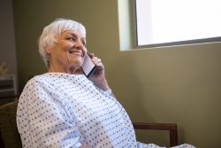 Ältere Patientin telefoniert im Krankenhaus am Mobiltelefon.